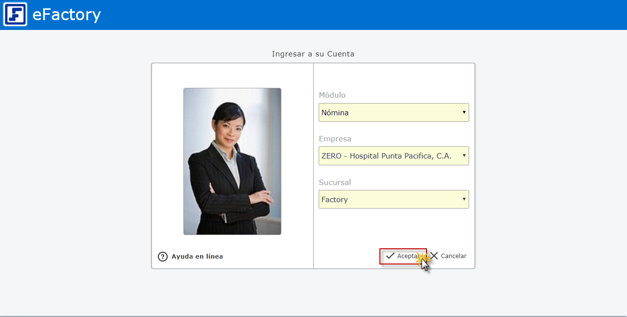 en eFactory, Luego seleccionaremos el sistema de Nómina, empresa y sucursal de la empresa