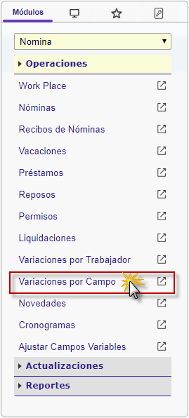 b. En el módulo Nómina, desplegamos el componente Operaciones y activamos el sub componente Variaciones por Campos.