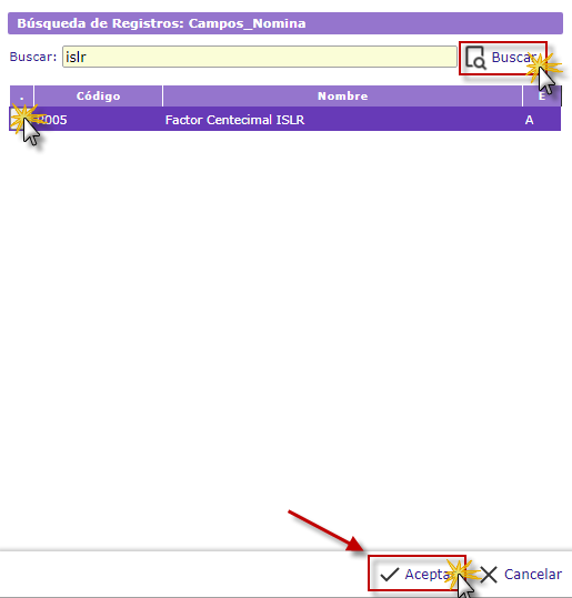y procedemos a marcaremos el campo Factor Centecimal ISLR y seleccionaremos el botón
