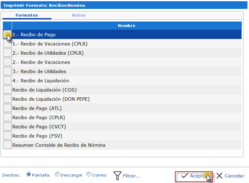 b. En el cuadro que se muestra, seleccionamos Recibo de Pago y presionamos el botón