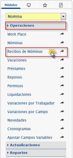 b. En el módulo Nómina, desplegamos el componente Operaciones y activamos el sub componente Recibos de Nóminas.