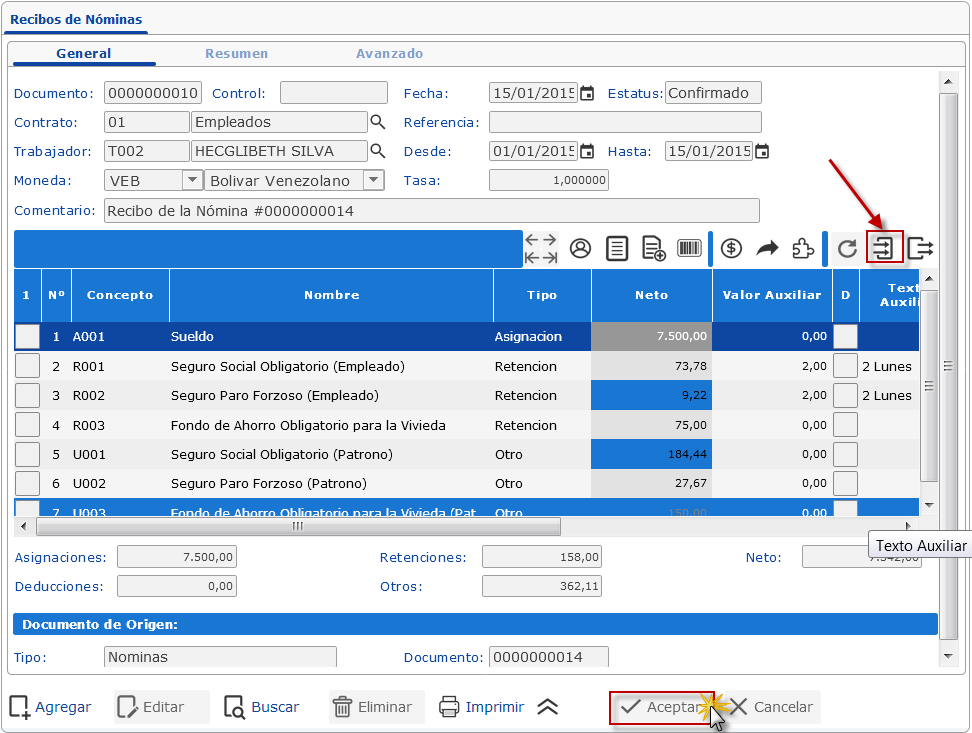 , ubicado al comienzo de dicha sección; para cada renglón, introducimos el Concepto, el Monto Neto y si aplica, el Valor Auxiliar y el Texto Auxiliar.