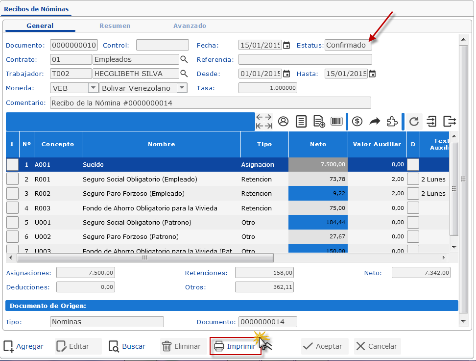 General, observamos que el Estatus del Recibo de Pago se ha establecido al valor Confirmado, procedemos a imprimirlo, presionamos el botón