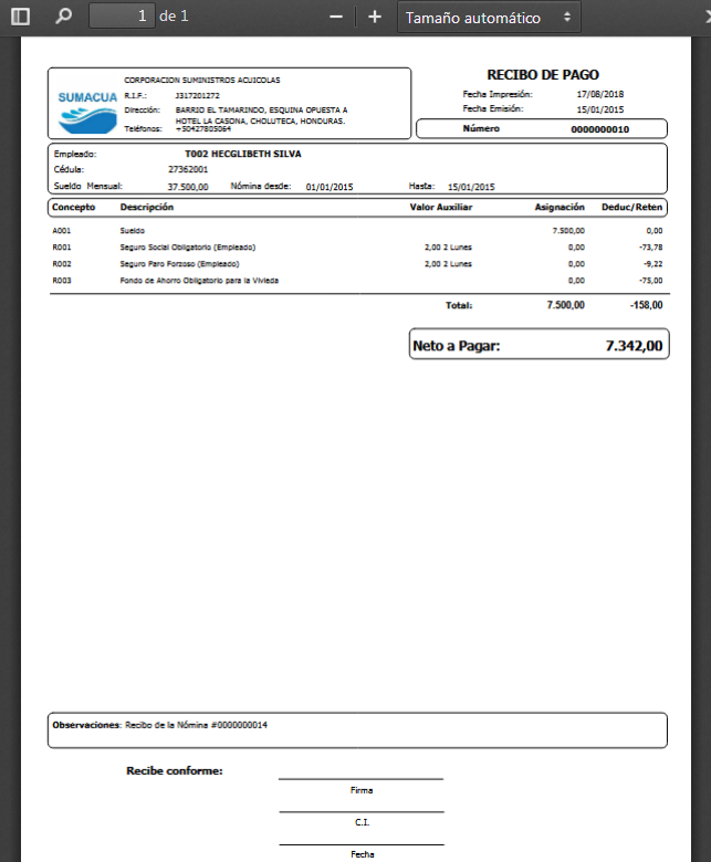 c. Verificamos la información mostrada en el Recibo de Pago y procedemos a su emisión vía correo o impreso.