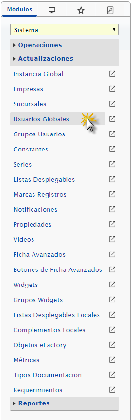 b. Después nos ubicamos en el menú, presionaremos la opción módulo donde se despliega la lista y seleccionamos el módulo de Sistema, desplegamos el componente Actualizaciones y activamos el maestro de Usuarios Globales.