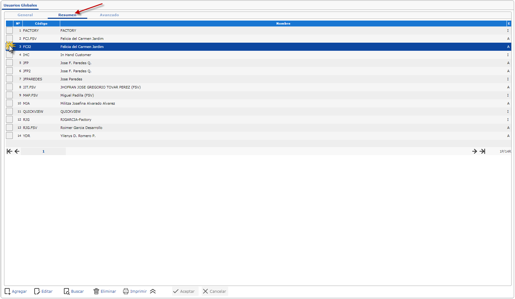 a. Para dar acceso a un usuario tenemos que buscar primero el usuario y para buscarlo nos ubicamos en la pantalla y seleccionamos la ficha Resumen y oprimimos el usuario.