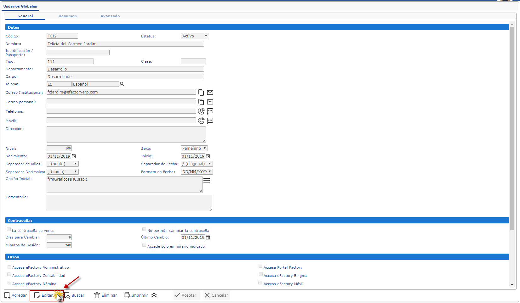 b. Luego se muestra el formulario y para darle acceso a eFactory Nómina nos ubicamos en la Sección Otros y marcamos la casilla de Accesa eFactory Nómina