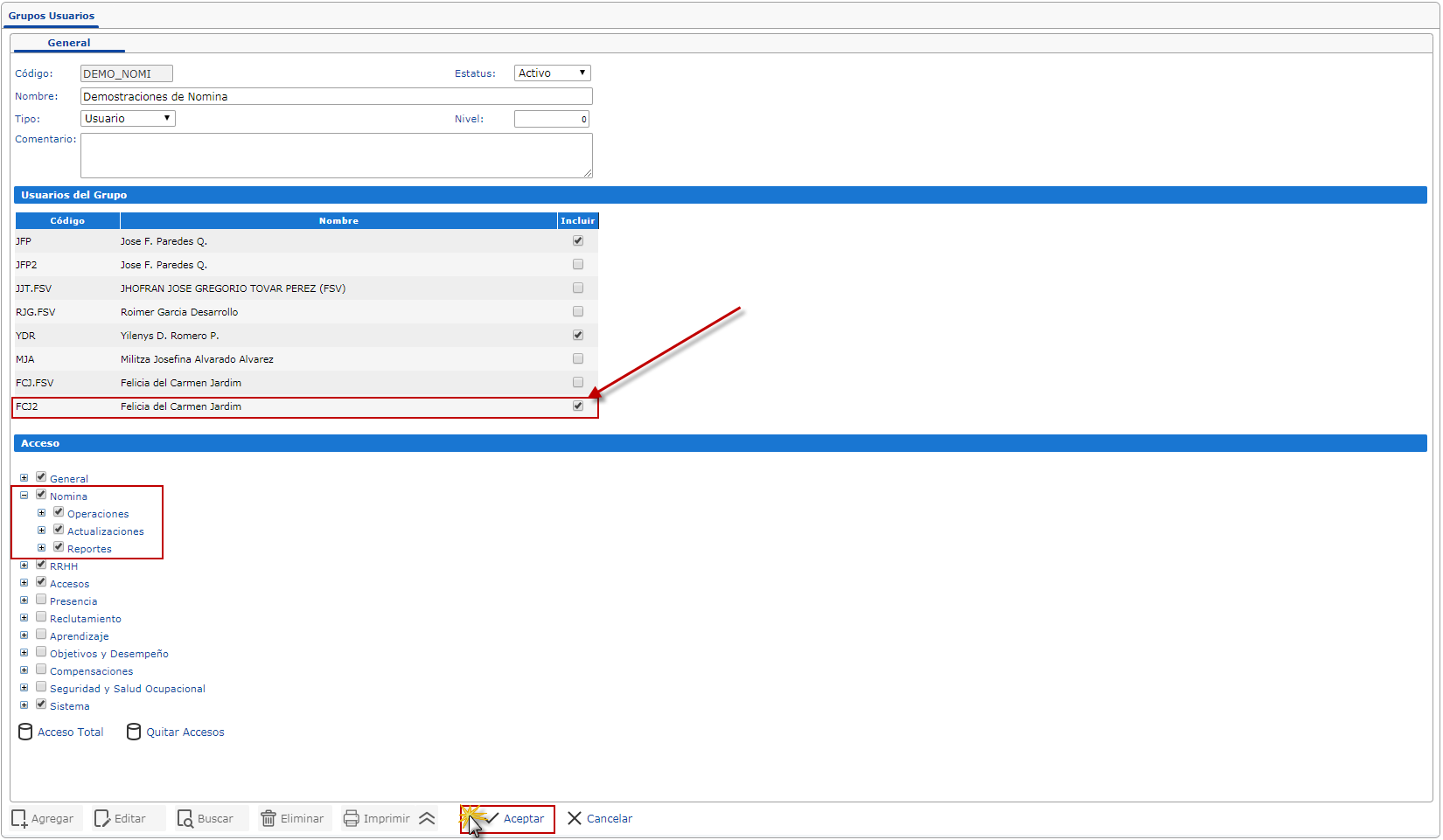 nos ubicamos en la sección Acceso y seleccionaremos la casilla de acceso al módulo de Nómina. Para finalizar oprimiremos el botón
