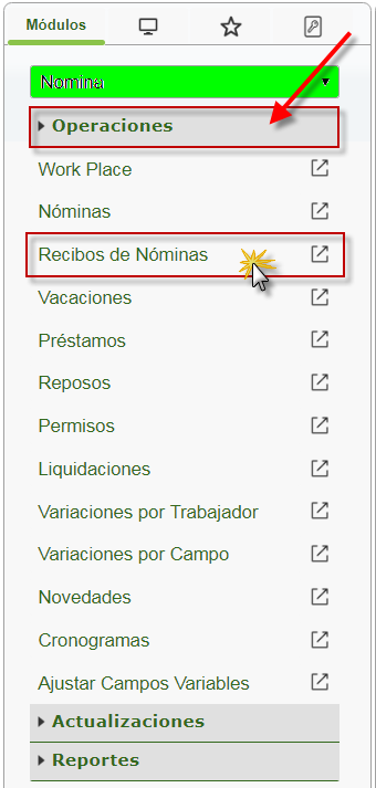 b. En el módulo Nómina, desplegamos el componente Operaciones y activamos el sub componente Recibos de Nóminas.