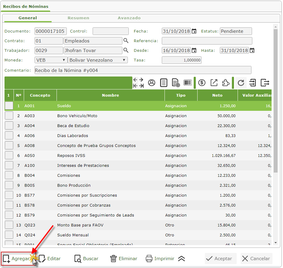 Ingresamos luego cada Concepto asociado al Recibo de Nómina en la sección de Renglones, presionando el ícono Agregar Renglón