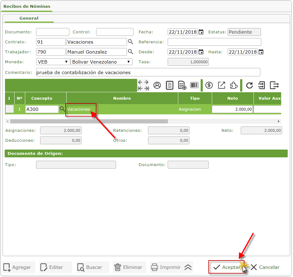 a. Se muestra la ventana de Recibos de Nóminas, donde procedemos a crear los datos de un nuevo recibo de vacaciones, presionando el botón