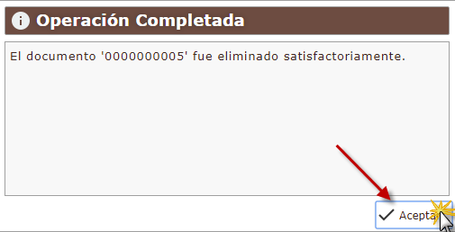 c. Luego de haber confirmado la eliminación, se nos muestra un aviso donde nos informa que la Operación fue Completada exitosamente, seleccionaremos el botón