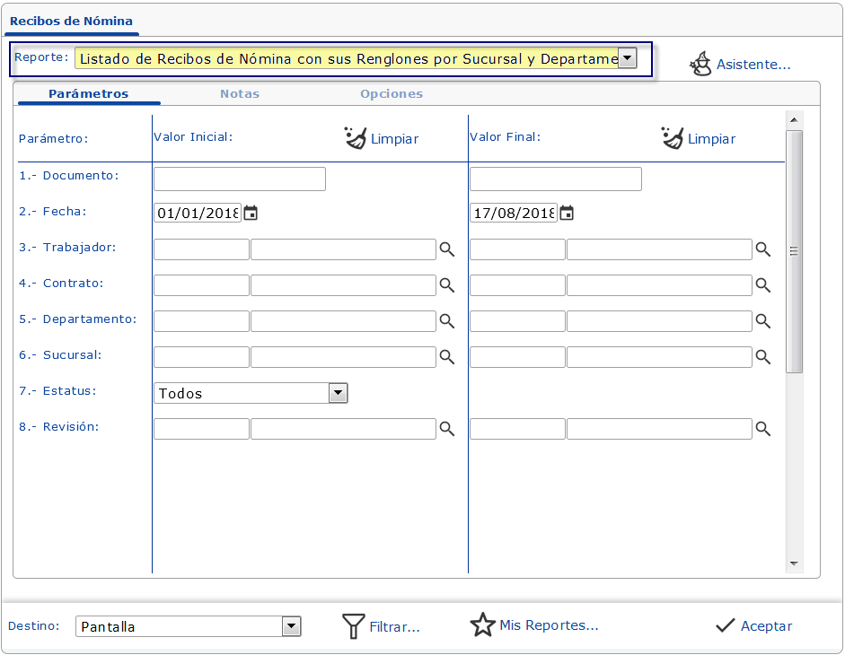 Veamos cómo preparar y emitir un Listado con los Recibos de Nómina, que contenga los Renglones asociados a los conceptos de cada trabajador, desglosado por Sucursal y por Departamento.