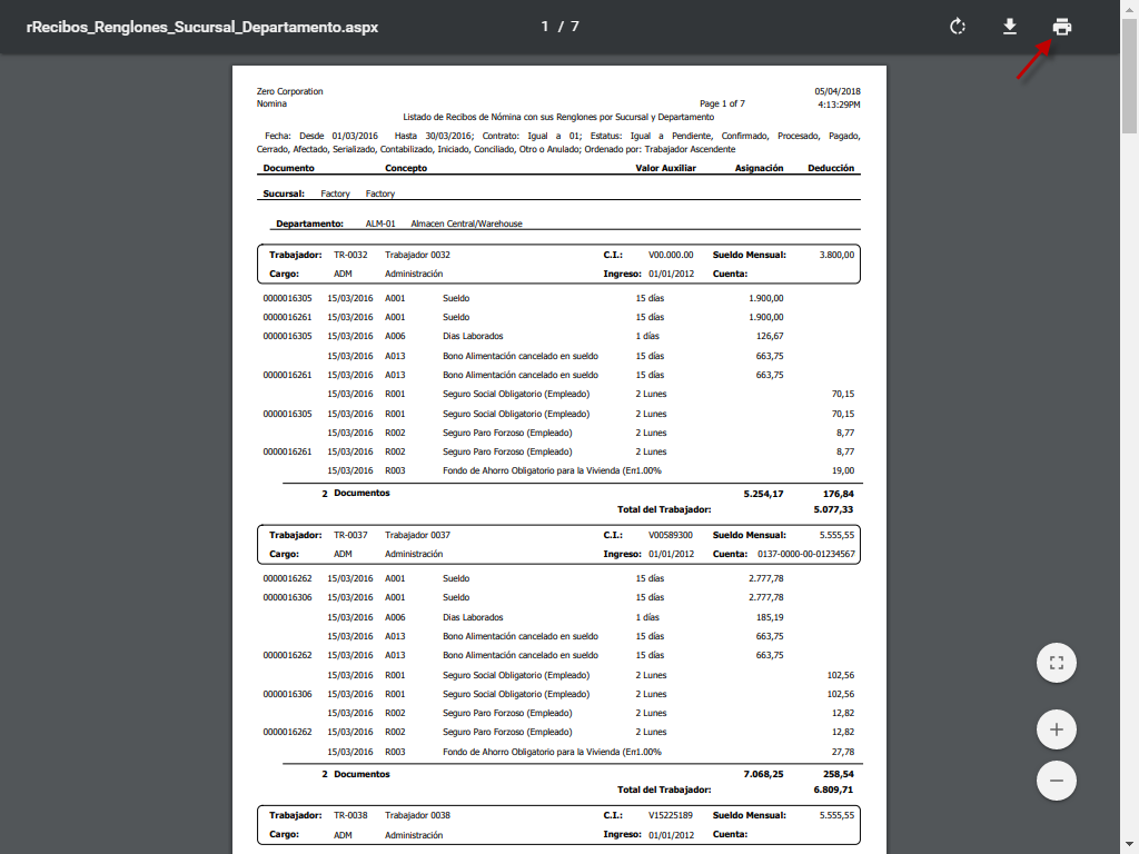 b. Luego de aceptar los parámetros, se muestra en pantalla el Listado de Recibos de Nómina, en el cual debemos verificar la información de conceptos, asignaciones, deducciones, sucursales, departamentos, entre otros, luego procedemos a guardarlo como un documento PDF o bien imprimirlo.