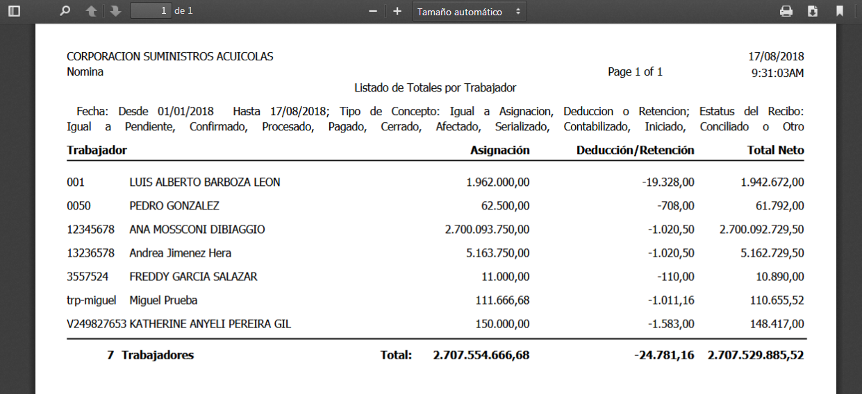b. Luego de aceptar los parámetros, se muestra en pantalla el Listado de Totales por Trabajador, en el cual debemos verificar la información (Trabajador, Asignaciones, Deducciones, Retenciones, Total Neto), luego procedemos a guardarlo como un documento pdf o bien imprimirlo.