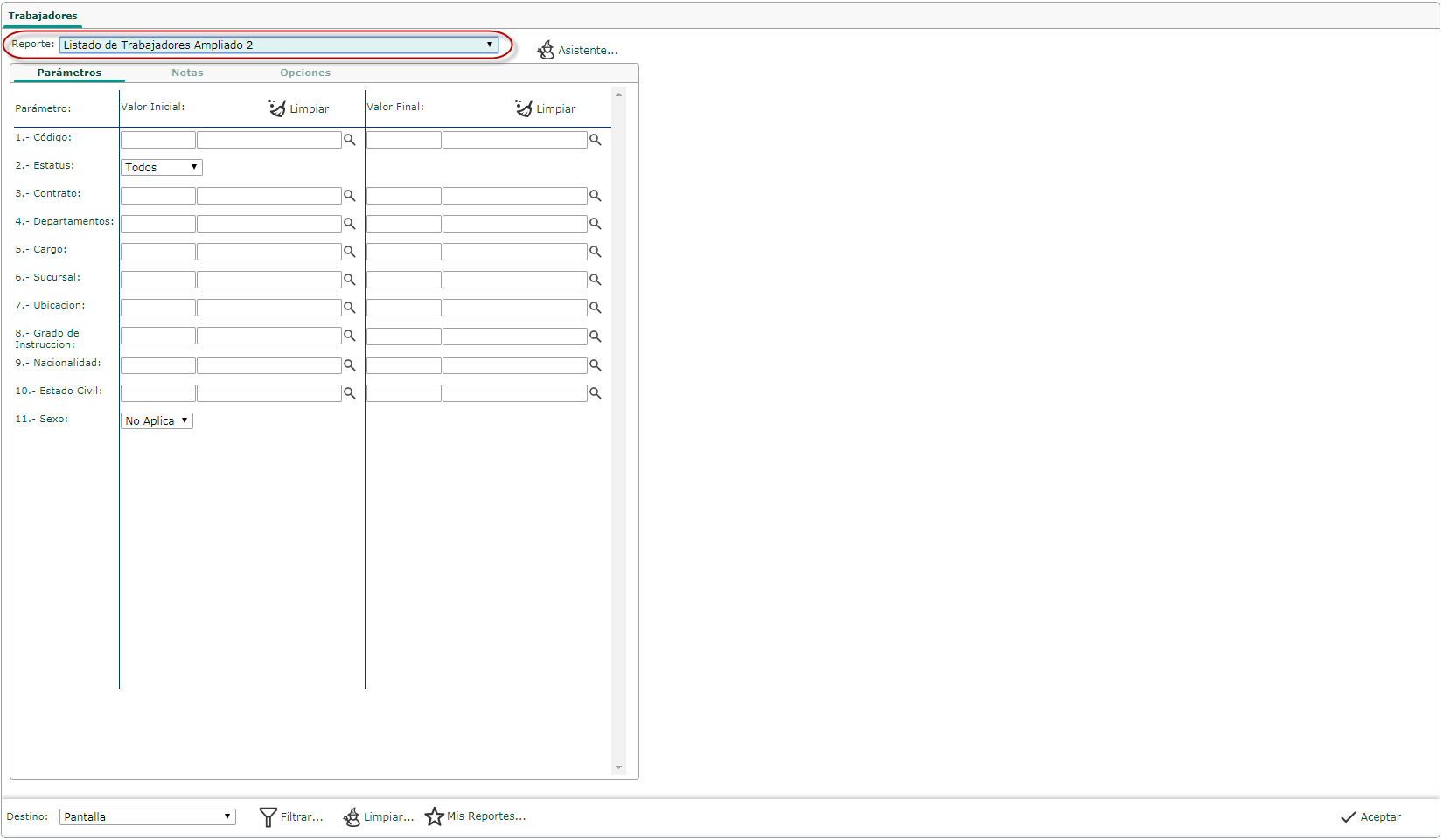 Listado de Trabajadores Ampliado 2, especificamos los Parámetros necesarios, entre estos: Contrato, Departamento, Sucursal, Estatus, entre otros.