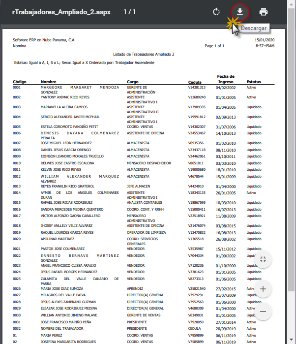 b. Luego de aceptar los Parámetros, se muestra en pantalla el Listado de Trabajadores Ampliado, en el cual debemos verificar la información (Código, Nombre, Cargo, Cédula, Ingreso y Estatus), luego procedemos a guardarlo como un documento pdf o bien imprimirlo.