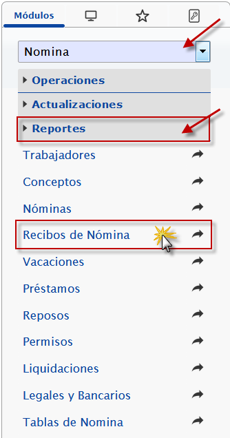 b. En el módulo Nómina, desplegamos el componente Reportes y activamos el sub componente Recibos de Nómina