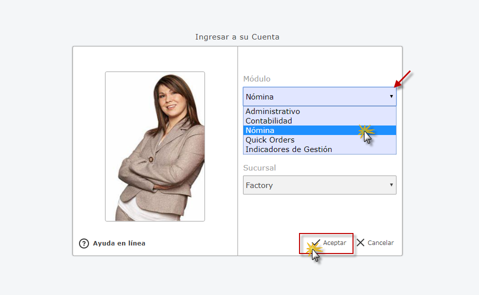 después seleccionaremos Módulo de Nómina Empresa y Sucursal de la Empresa y presionamos el botón
