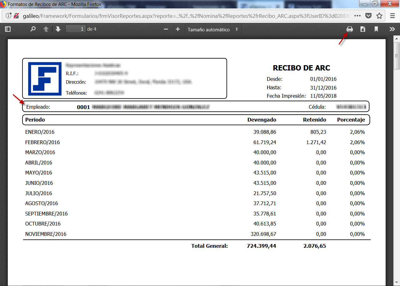 b. Luego de aceptar los Parámetros, se muestra en pantalla el Formato de Recibos de ARC, el cual se genera en páginas separadas para cada Trabajador, verificamos la información y luego procedemos a guardarlo como un documento pdf o bien imprimirlo.