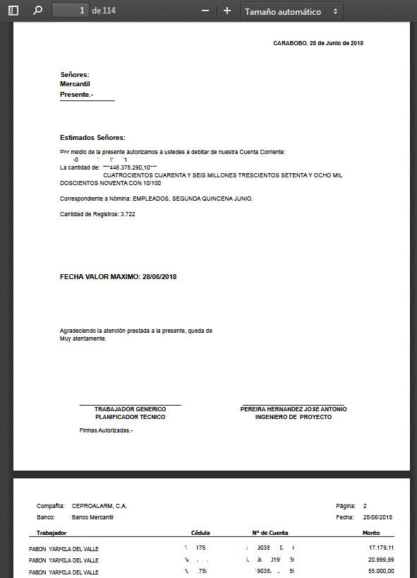 se observa la carta bancaria para pago de nómina, lo cual se envia al banco para notificar el motivo y monto de pago de nómina.