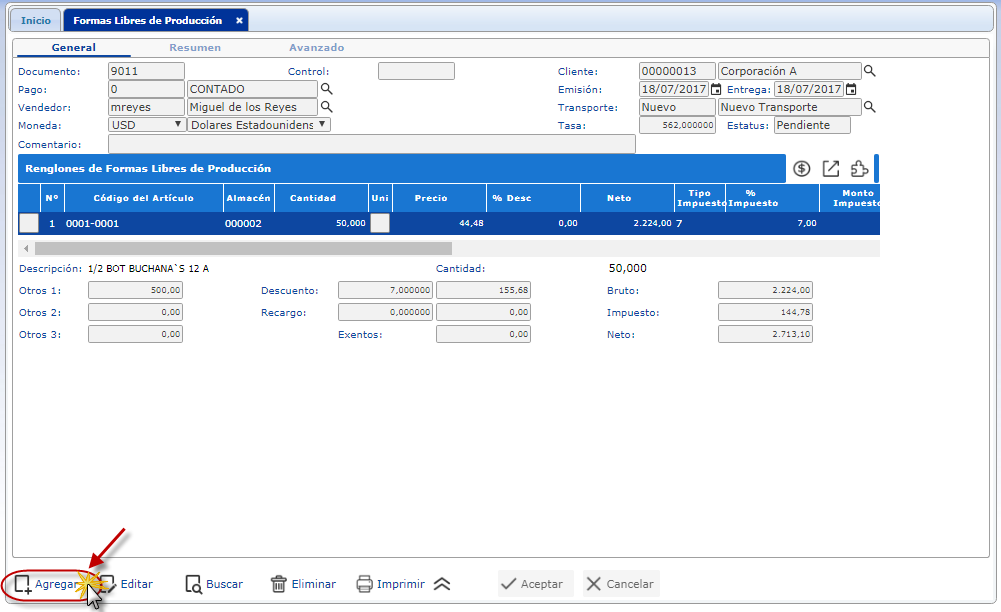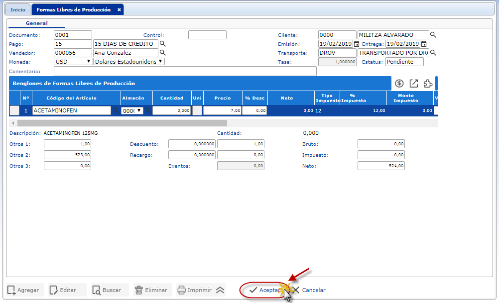 c. Luego de haber completado la ficha de Formas Libres de Producción procedemos a seleccionar el botón