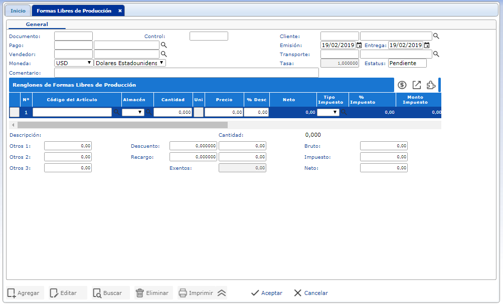 se muestra la ficha de Formas Libres de Producción donde procedemos a llenar los siguientes campos: