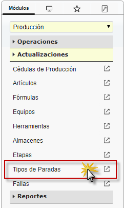 b. En el módulo Producción, desplegamos el componente Actualizaciones y activamos el sub. componente Tipos de Paradas.