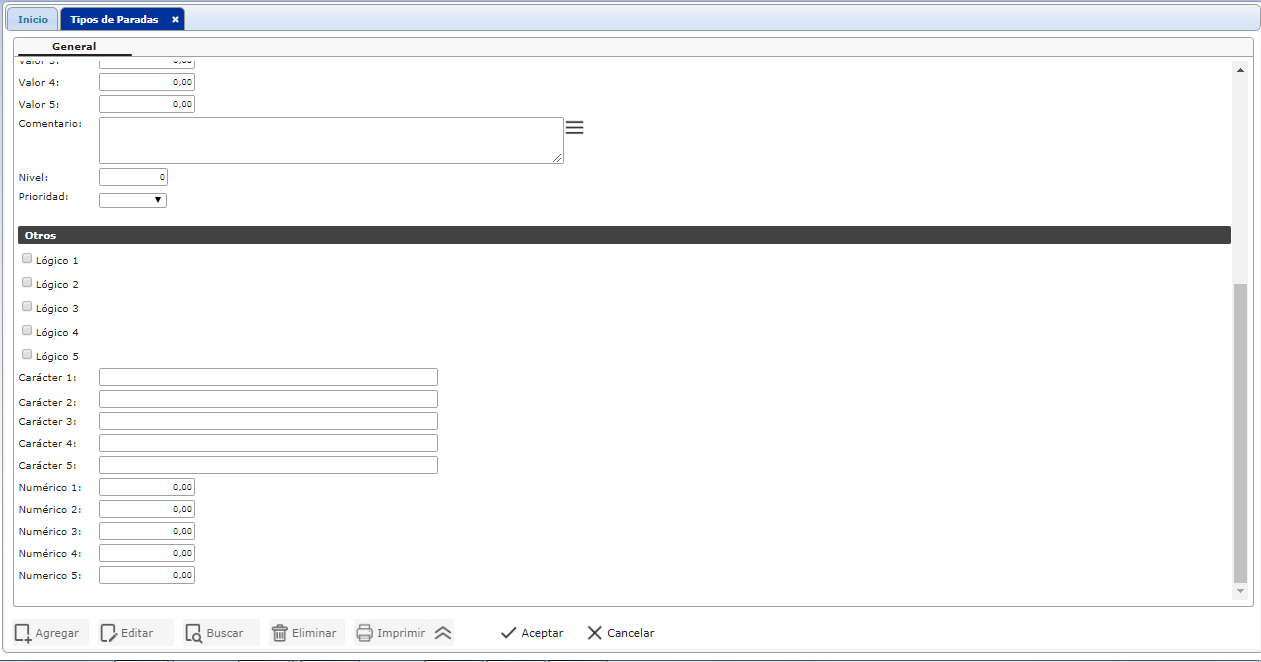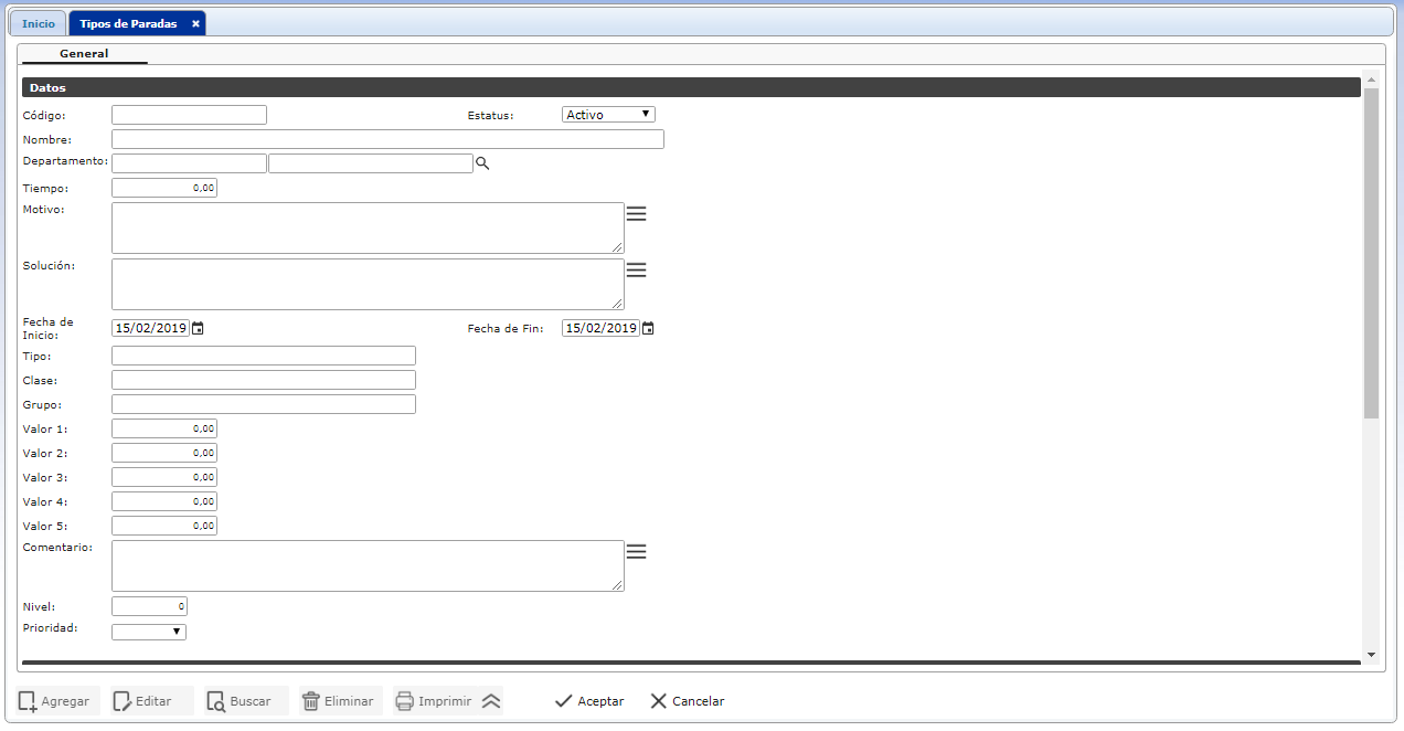 se muestra el formulario de Tipos de Paradas donde procedemos a llenar los campos de formulario.