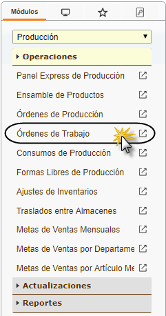 a. Al haber ingresado ya a eFactory debemos desplegar la lista y seleccionar el módulo Producción, también desplegamos el componente Operaciones y activamos el sub. componente Órdenes de Producción.