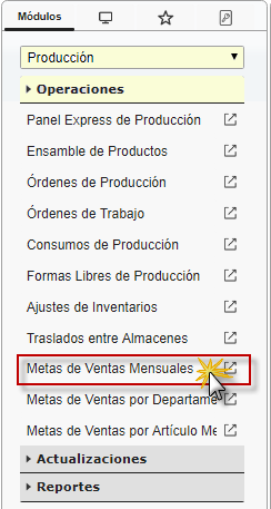 a. Al haber ingresado a eFactory debemos desplegar la lista y seleccionar el módulo Producción, también desplegamos el componente Operaciones y activamos el sub. componente Metas de Ventas Mensuales.