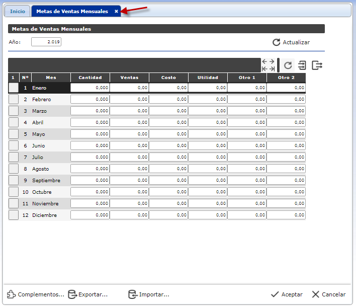 En este formulario puedes cargar las metas de ventas propuestas por mes, puedes seleccionar un año en específico y cargar los siguientes datos: cantidad mensual, ventas, costo, utilidad, otro 1, otro 2. También puedes importar o exportar las metas de un año en formato XML.