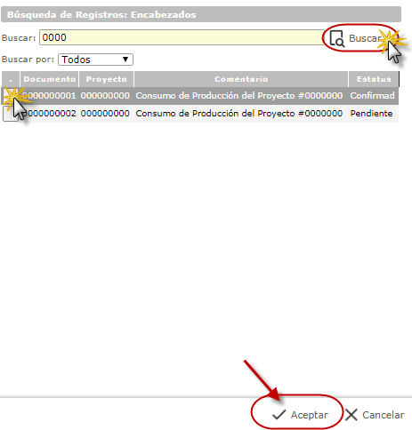 y colocamos el nombre de la Consumos de Producción que deseamos encontrar y después seleccionaremos el botón