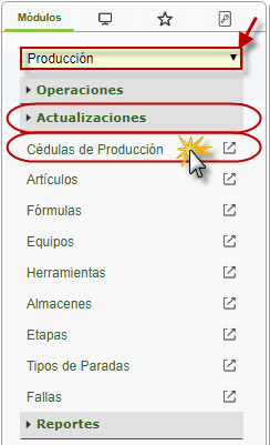 b. En el módulo Producción, desplegamos el componente Actualizaciones y activamos el sub. componente Cédulas de Producción.