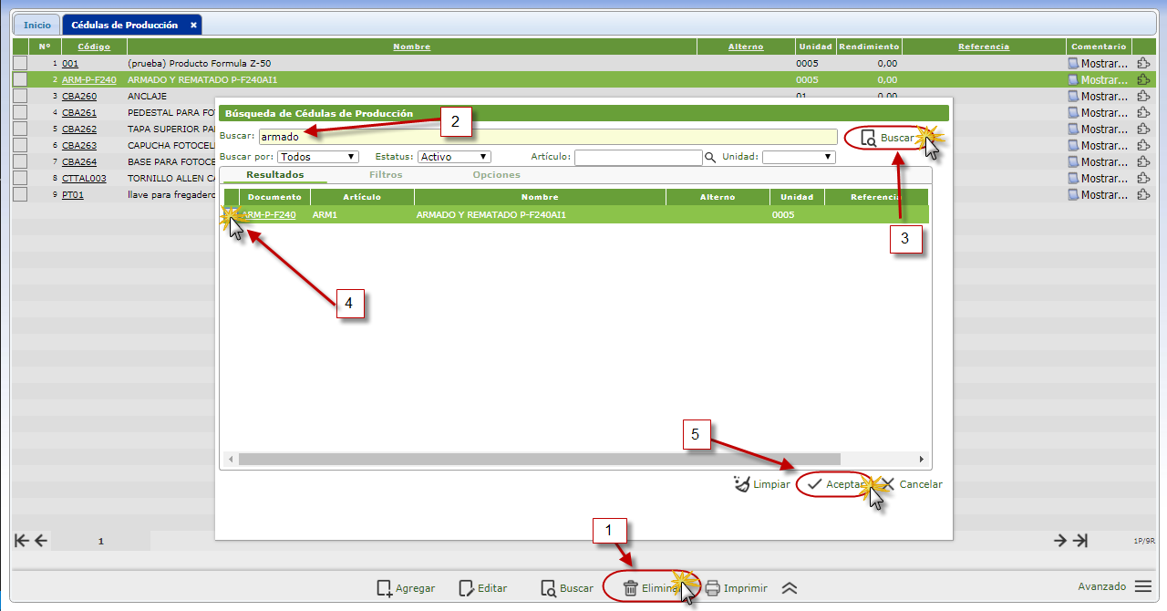 y colocamos el nombre de la cédula de Producción que deseamos encontrar y después seleccionaremos el botón