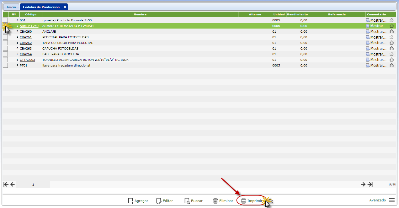 de la cédula de Producción que deseemos imprimir.