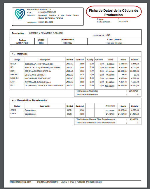 A través de esta opción es posible imprimir el formato de ficha de datos de la cédula de producción seleccionada, donde nos permite saber la cantidad de materiales, costo, monto y unidades que se debe tener para la elaboración de una sola cédula de producción y la mano de obra.