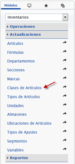 b. En el módulo Inventarios, desplegamos el componente Actualizaciones y activamos el sub componente Clases de Artículos.