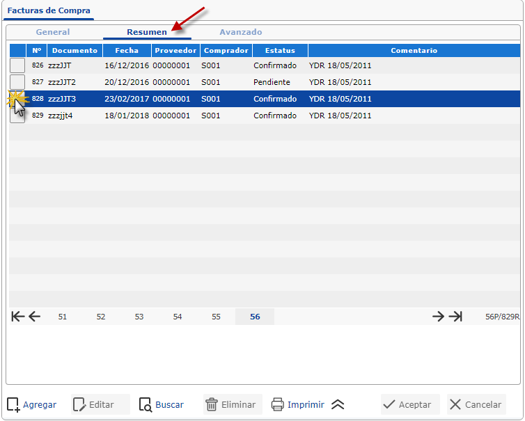a. Al seleccionar Facturas de Compras, presionamos la pestaña de resumen y procedemos a seleccionar el documento que deseemos escanear.