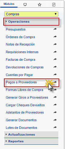 b. En el módulo Compras, desplegamos el componente Operaciones y activamos el sub componente Pagos a Proveedores.