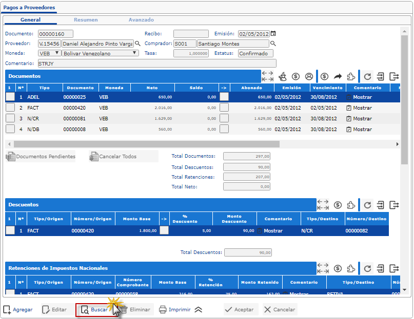 c. Se muestra la ventana Pagos a Proveedores, para modificar un Documento, primero debemos ubicarlo en el sistema; presionamos el botón