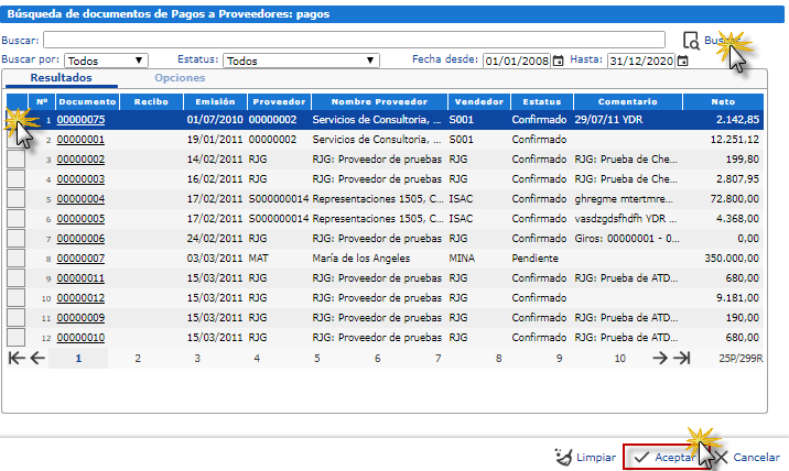 Aparece un listado reducido a los criterios de búsqueda especificados, procedemos a seleccionar aquel Pago a Proveedores que vamos a modificar, presionando el cuadro ubicado a su izquierda y luego el botón