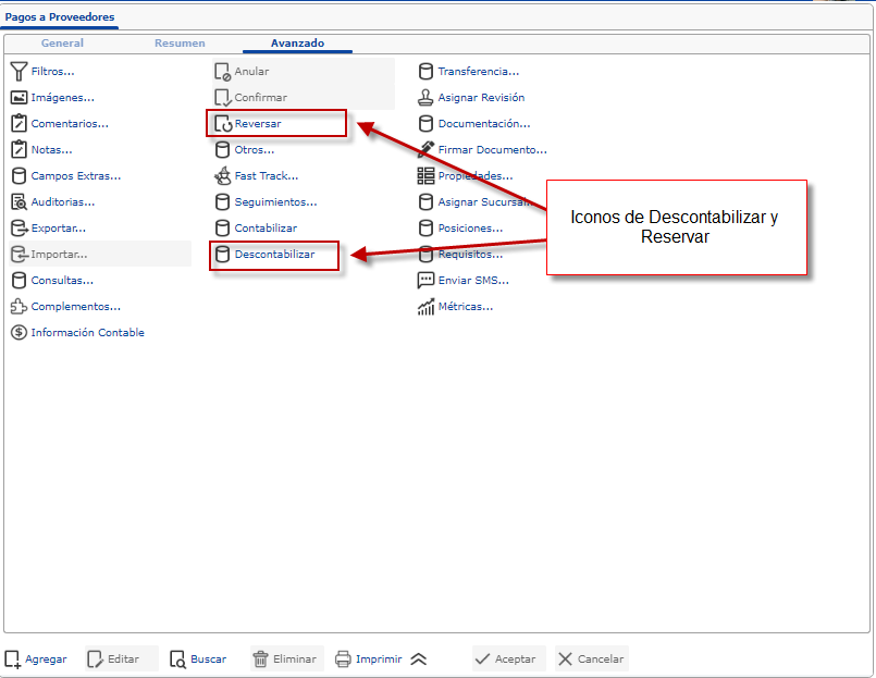 c. En la ventana Pagos a Proveedores, ficha Avanzado, presionamos el ícono Descontabilizar y luego Reversar.