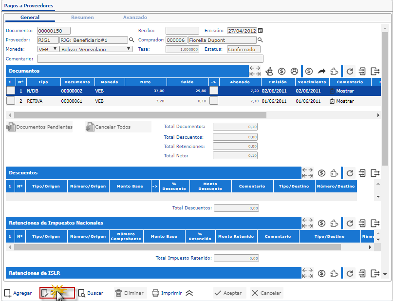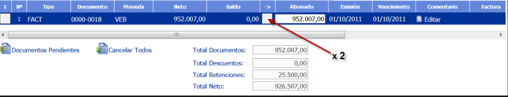 b. Una forma de actualizar las Retenciones de un Pago, es actualizando primero el monto abonado en la sección Documentos, para ello presionamos dos veces el cuadro ubicado a la izquierda de la columna Abonado, esto reinicia los montos Retenidos y los habilita para ser modificados.