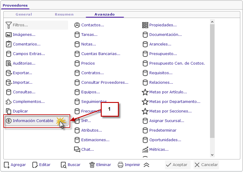 a. Al seleccionar el Proveedor procedemos a hacer clic en la pestaña Avanzado.
