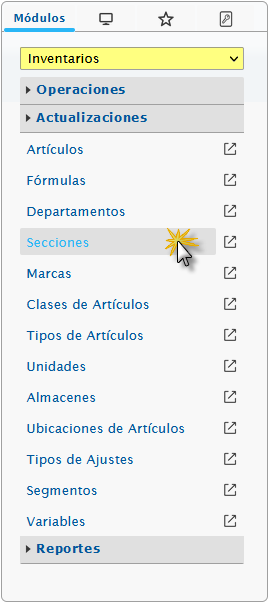 a. Al ingresar en el sistema debemos seleccionar el módulo Inventarios y al desplegar la sección de Actualizaciones seleccionaremos la opción de Secciones.