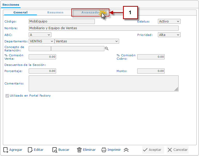 a. Luego de haber seleccionado la opción de Secciones se muestra la pantalla donde debemos hacer clic en la pestaña Avanzado.