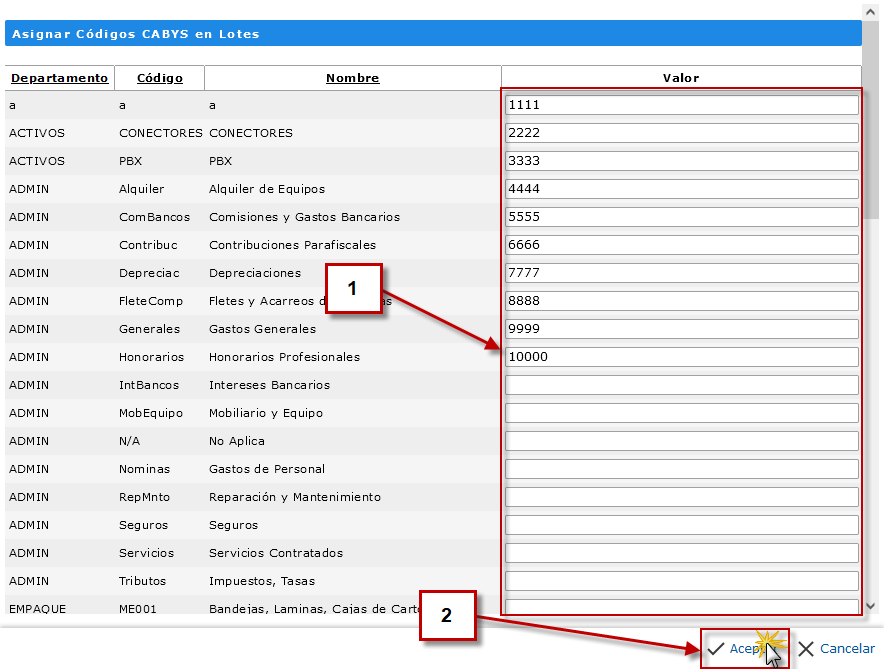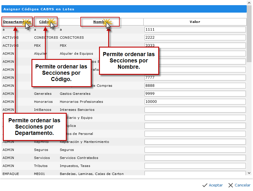Adicionalmente, puede modificar el orden en que se muestran los registros haciendo clic en la columna Departamento, en la columna Código y en la columna Nombre.