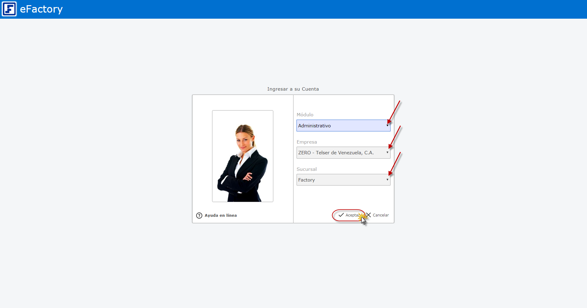 a. Ingresamos a eFactory con nuestro Usuario, Contraseña y presionaremos el botón