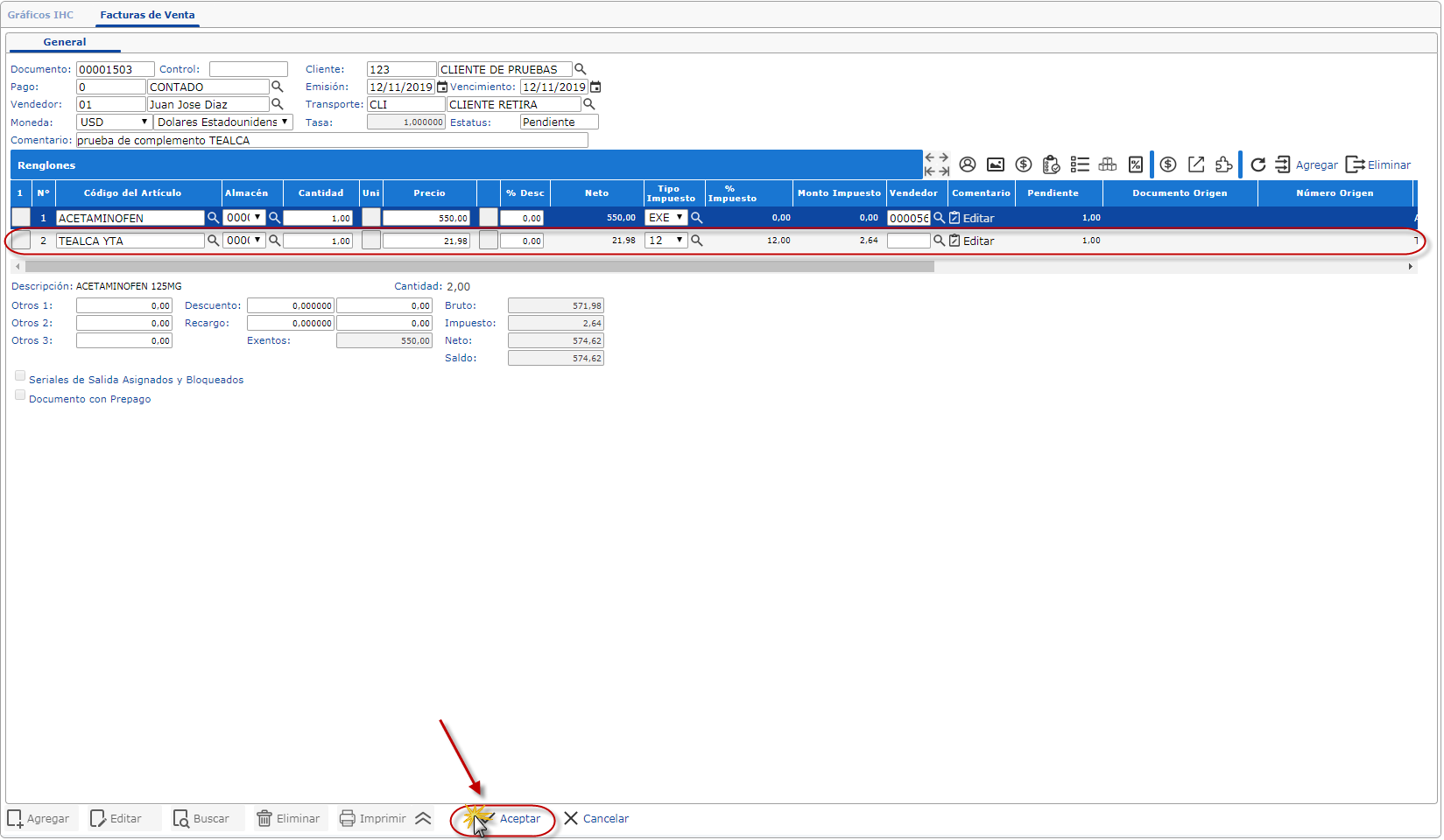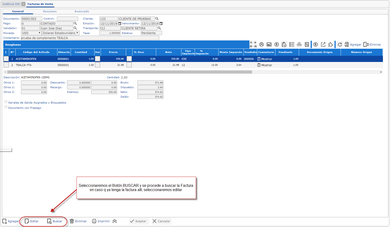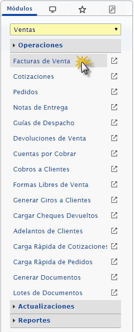 se muestra la pantalla de la Facturas de Venta en tan caso podemos seleccionar el botón